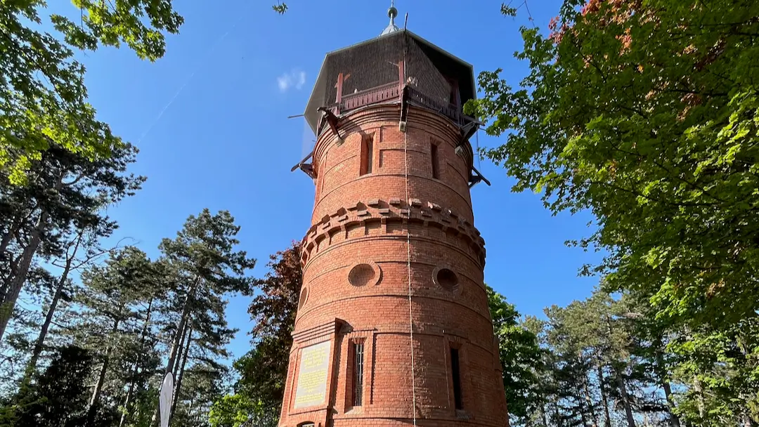 Der erste Teil des Türkenschanzparks wurde1888 eröffnet, daran erinnert eine Gedenktafel beim Aufgang. Der Turm hatte damals eine Doppelfunktion: Die untere Hälfte diente als Wassertank zur Bewässerung der Pflanzen im Park – dieser Tank existiert übrigens bis heute. Darüber ist dann ein innen gelegenes Stiegenhaus und die Aussichtsplattform.